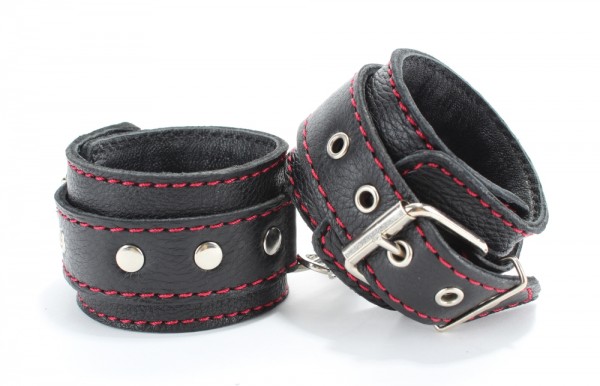 Наручники и оковы выполнены из натуральной кожи в черном цвете. Декор из металлических клепок